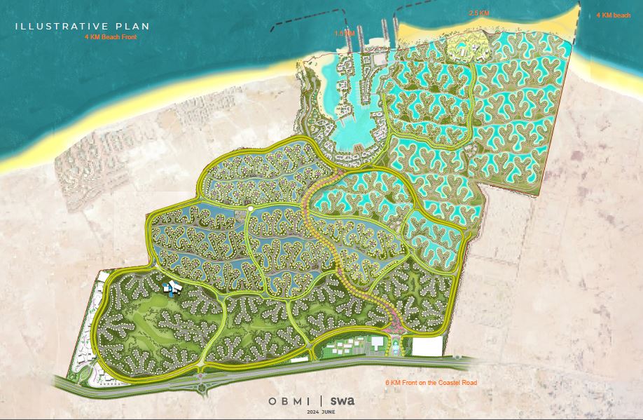 عرض شاطئ 4 كيلـو يشمل 2.5 شاطئ و 1.5 مارينا ويعتبر الشاطئ والمارينا هي الأكبر علي الاطلاق في الساحل الشمالي والبحر المتوسط